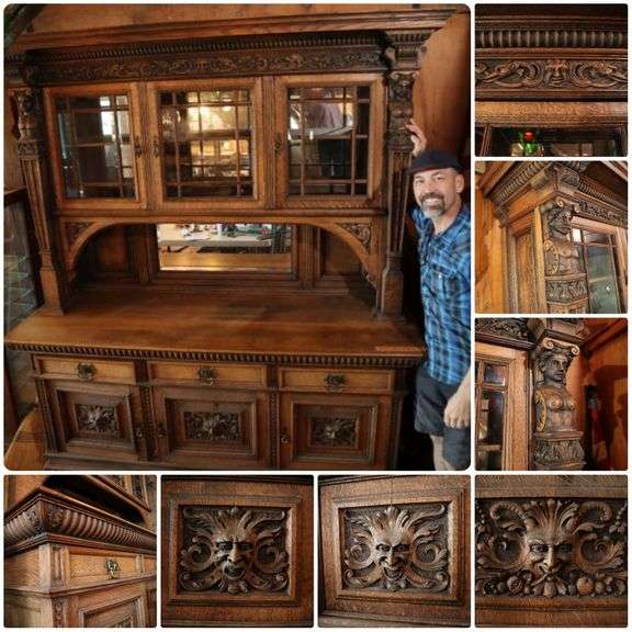 Large Antique English Oak Buffet, Ornately Carved Throughout;Green Man Carvings, Dentil Molding, Acanthus Leaves, Columns Of A Man And Woman Flank The Top, 79"w X 28"d X 94"h, The top of the base has been filled at some point in its life, this cabinet is extremely well built to last. This will be a focal point of any room.