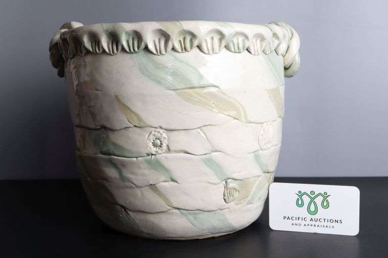 Handmade Ceramic Vase, Green And Cream Glaze Stripes, Twisted Handles And Imprinted Details, 11X10X8-1/2", 11#
