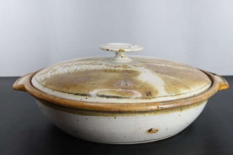 Large Stoneware Covered Dish, Brown And Yellow Glaze, Base= 15.5X3.5" Lid =13X2.75, 9#