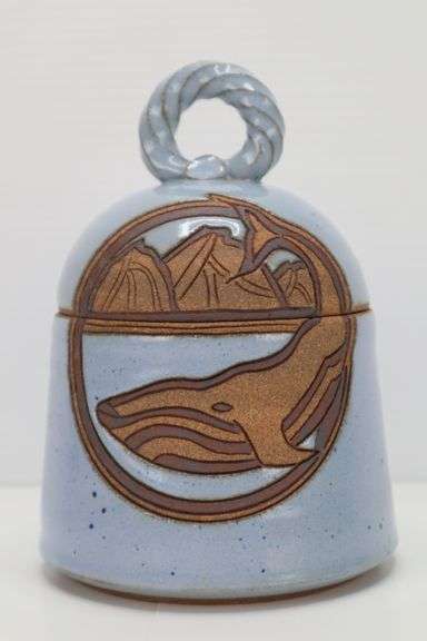 Handmade Stoneware Covered Jar, Depicting A Humpback Whale And Mountains, Having Slate Blue Glaze With Brown Outlines, With A Twisted Round Handle, Signed Burke.