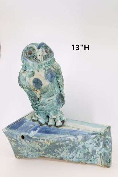 Marilyn Stiles Handmade Sculpture, Green, Turquoise-Blue And White Glazed Owl Atop An Architectural Element, 10X8X13"H, 10#.