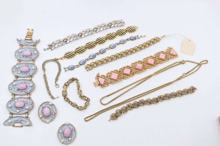 DESCRIPTION: VINTAGE FASHION JEWELRY, BRACELETS, CHAINS, BLUE CATS EYE BRACELET, PINK STONE BRACELET CONDITION: Please See Photos For Condition. Condition Is Commensurate With Age And Use. We Aim To Take Additional Photos Of Any Noticeable Damage Or Defect. Please Email Auctionmanager@Pacificauctions.Net For Any Additional Condition Inquiries.