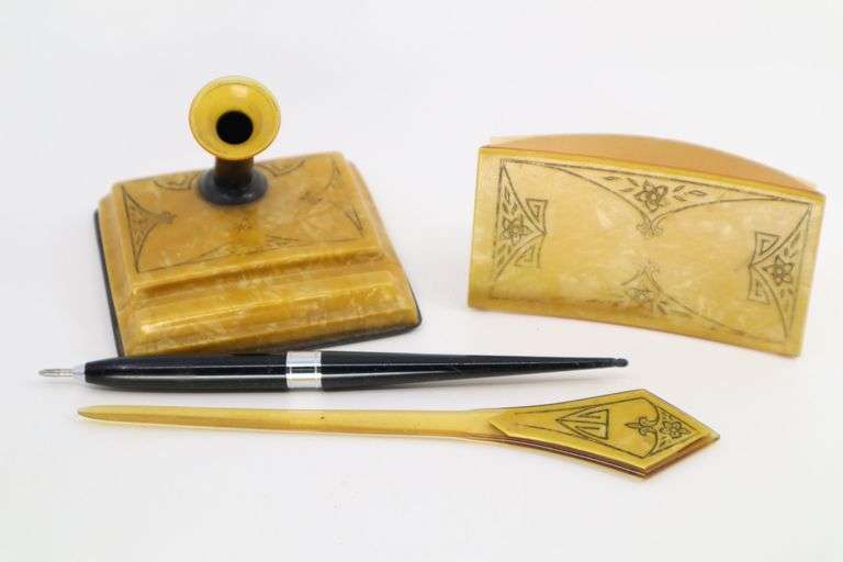 DESCRIPTION: ART DECO BAKELITE FOUNTAIN PEN DESK SET CONDITION: Please See Photos For Condition. Condition Is Commensurate With Age And Use. We Aim To Take Additional Photos Of Any Noticeable Damage Or Defect. Please Email Auctionmanager@Pacificauctions.Net For Any Additional Condition Inquiries.