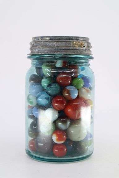 DESCRIPTION: ANTIQUE BLUE GLASS PINT JAR OF MARBLES WITH ZINC LID CONDITION: Please See Photos For Condition. Condition Is Commensurate With Age And Use. We Aim To Take Additional Photos Of Any Noticeable Damage Or Defect. Please Email Auctionmanager@Pacificauctions.Net For Any Additional Condition Inquiries.