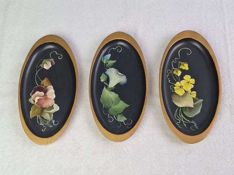 DESCRIPTION: SET OF 3 WOODEN TRAYS, HAND PAINTED FLOWERS ON BLACK WITH GOLD GILT BORDERS, FLAT TRAYS, CAN ALSO HANG, SIGNED FRAN '83, 8.75".. CONDITION: Please See Photos For Condition. Condition Is Commensurate With Age And Use. We Aim To Take Additional Photos Of Any Noticeable Damage Or Defect. Please Email Auctionmanager@Pacificauctions.Net For Any Additional Condition Inquiries.
