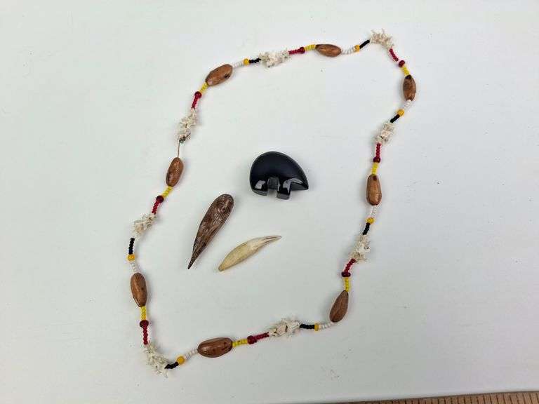 DESCRIPTION: VERTEBRA, BEAD AND SEED NECKLACE, FOSSILIZED TEETH (THE BROWN ONE IS CARVED), CARVED STONE BEAR.. CONDITION: Please See Photos For Condition. Condition Is Commensurate With Age And Use. We Aim To Take Additional Photos Of Any Noticeable Damage Or Defect. Please Email Auctionmanager@Pacificauctions.Net For Any Additional Condition Inquiries.