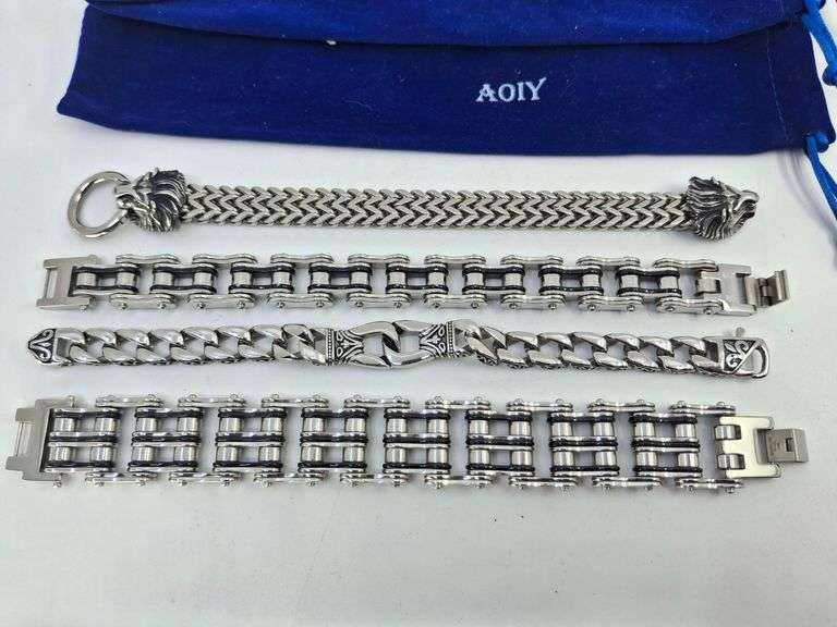 DESCRIPTION: 4) STAINLESS STEEL BRACELETS, ALL APPROX. 9". CONDITION: Please See Photos For Condition. Condition Is Commensurate With Age And Use. We Aim To Take Additional Photos Of Any Noticeable Damage Or Defect. Please Email Auctionmanager@Pacificauctions.Net For Any Additional Condition Inquiries.