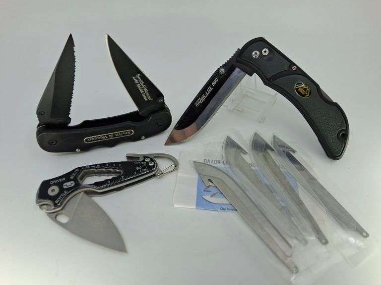 DESCRIPTION: THREE FOLDING KNIVES, SMITH & WESSON, RAZOR-LITE WITH EXTRA BLADES, AND UTILITY KNIFE. CONDITION: Please See Photos For Condition. Condition Is Commensurate With Age And Use. We Aim To Take Additional Photos Of Any Noticeable Damage Or Defect. Please Email Auctionmanager@Pacificauctions.Net For Any Additional Condition Inquiries.