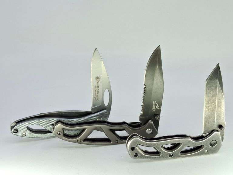 DESCRIPTION: THREE SKELETON HANDLE FOLDING KNIVES, SMITH & WESSON EXTREME OPS, GERBER, SMITH & WESSON EXTREME OPS. CONDITION: Please See Photos For Condition. Condition Is Commensurate With Age And Use. We Aim To Take Additional Photos Of Any Noticeable Damage Or Defect. Please Email Auctionmanager@Pacificauctions.Net For Any Additional Condition Inquiries.