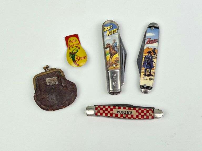 DESCRIPTION: COLLECTIBLES- GENE AUTRY POCKET KNIFE, ZORO POCKET KNIFE, PURINA ADVERTISING FOLDING KNIFE, POLI-PARROT SHOES ADVERTISING PIN, LEATHER COIN PURSE. CONDITION: Please See Photos For Condition. Condition Is Commensurate With Age And Use. We Aim To Take Additional Photos Of Any Noticeable Damage Or Defect. Please Email Auctionmanager@Pacificauctions.Net For Any Additional Condition Inquiries.