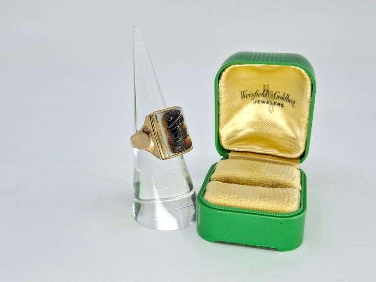 DESCRIPTION: GOLD RING WITH CARVED STONE, 10K 5.63 G, SZ 5.5. CONDITION: Ring band has been cut. Please See Photos For Condition. Condition Is Commensurate With Age And Use. We Aim To Take Additional Photos Of Any Noticeable Damage Or Defect. Please Email Auctionmanager@Pacificauctions.Net For Any Additional Condition Inquiries.