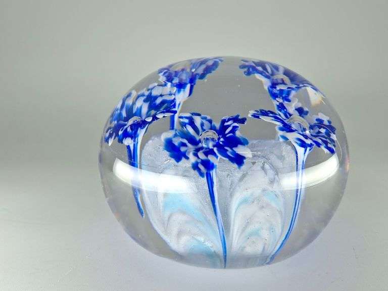 DESCRIPTION: VINTAGE HAND-BLOWN ART GLASS PAPERWEIGHT FEATURING BLUE AND WHITE FLOWERS WITH CONTROLLED BUBBLES, 3.4". CONDITION: Severa small flea bites. Please See Photos For Condition. Condition Is Commensurate With Age And Use. We Aim To Take Additional Photos Of Any Noticeable Damage Or Defect. Please Email Auctionmanager@Pacificauctions.Net For Any Additional Condition Inquiries.