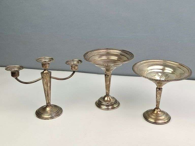 DESCRIPTION: WEIGHTED STERLING SILVER ITEMS 732 G TOTAL, CANDLE STAND 8-1/4X7" 243 G, 2)COMPOTES 6X6-1/2" 489 G.. CONDITION: Please See Photos For Condition. Condition Is Commensurate With Age And Use. We Aim To Take Additional Photos Of Any Noticeable Damage Or Defect. Please Email Auctionmanager@Pacificauctions.Net For Any Additional Condition Inquiries.