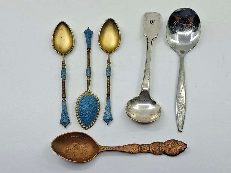 DESCRIPTION: GROUP OF 6) SMALL COLLECTOR SPOONS; 3) GILT AND CLOISONNE ENAMEL, COPPER "LOG CABIN CHURCH JUNEAU, ALASKA.". CONDITION: Please See Photos For Condition. Condition Is Commensurate With Age And Use. We Aim To Take Additional Photos Of Any Noticeable Damage Or Defect. Please Email Auctionmanager@Pacificauctions.Net For Any Additional Condition Inquiries.