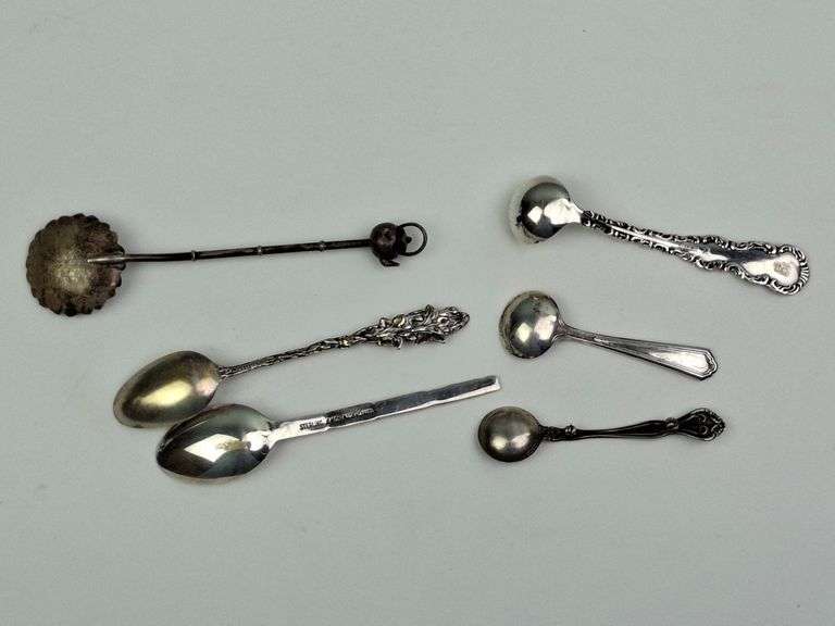 DESCRIPTION: GROUP OF 6) STERLING SILVER SPOONS 33 G TOTAL, INCLUDES JAPANESE TEAPOT, "SAN DIEGO" "SALMON ARM, B.C." SOUVENIR SPOONS, PLUS THREE SALT SPOONS.. CONDITION: Please See Photos For Condition. Condition Is Commensurate With Age And Use. We Aim To Take Additional Photos Of Any Noticeable Damage Or Defect. Please Email Auctionmanager@Pacificauctions.Net For Any Additional Condition Inquiries.