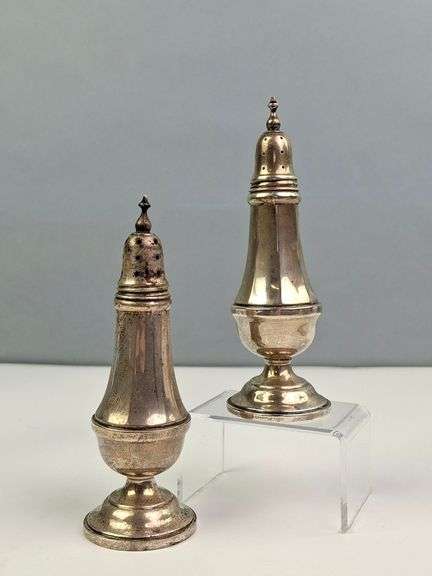 DESCRIPTION: STERLING SILVER WEIGHTED SALT AND PEPPER SHAKERS, 6" 150.71 G.. CONDITION: Please See Photos For Condition. Condition Is Commensurate With Age And Use. We Aim To Take Additional Photos Of Any Noticeable Damage Or Defect. Please Email Auctionmanager@Pacificauctions.Net For Any Additional Condition Inquiries.