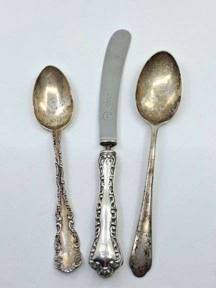 DESCRIPTION: STERLING SILVER FLATWARE; WHITING SPOON 5-3/4" 20.24 G, BIRKS SPOON & KNIFE(STAINLESS BLADE) 50 G. CONDITION: Please See Photos For Condition. Condition Is Commensurate With Age And Use. We Aim To Take Additional Photos Of Any Noticeable Damage Or Defect. Please Email Auctionmanager@Pacificauctions.Net For Any Additional Condition Inquiries.