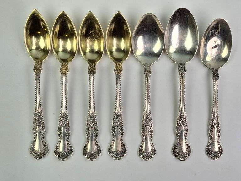 DESCRIPTION: 1899 GORHAM "CAMBRIDGE" STERLING SILVER FLATWARE 155 G TOTAL; 3) 5 O'CLOCK TEASPOONS 5-3/8" 64 G, 4) FRUIT SPOONS(GOLD WASH) 5-3/4" 91 G.. CONDITION: Please See Photos For Condition. Condition Is Commensurate With Age And Use. We Aim To Take Additional Photos Of Any Noticeable Damage Or Defect. Please Email Auctionmanager@Pacificauctions.Net For Any Additional Condition Inquiries.