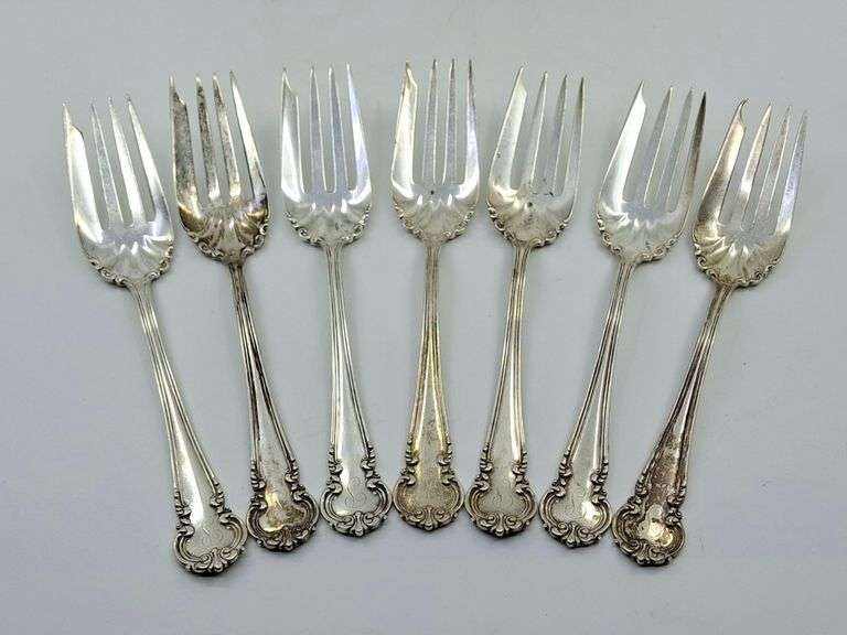 DESCRIPTION: 1897 REED & BARTON "LA COMTESSE" 7) STERLING SILVER SCALLOPED SALAD FORKS 6-1/4" 210 G TOTAL, MADE BY SHREVE & CO.. CONDITION: Please See Photos For Condition. Condition Is Commensurate With Age And Use. We Aim To Take Additional Photos Of Any Noticeable Damage Or Defect. Please Email Auctionmanager@Pacificauctions.Net For Any Additional Condition Inquiries.