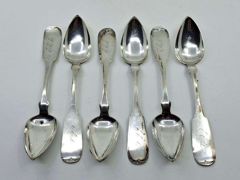 DESCRIPTION: 1830-1860'S 6) COIN SILVER FRUIT SPOONS BY NEWELL MATSON, DANVILLE, NY 6-1/8" 109 G TOTAL.. CONDITION: Please See Photos For Condition. Condition Is Commensurate With Age And Use. We Aim To Take Additional Photos Of Any Noticeable Damage Or Defect. Please Email Auctionmanager@Pacificauctions.Net For Any Additional Condition Inquiries.