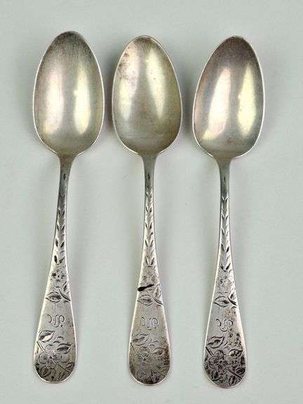 DESCRIPTION: 3) BRIGHT CUT STERLING SILVER SPOONS 63.61 G TOTAL, MADE BY C. PREUSSER & BRO, "S", 5-3/4". CONDITION: Please See Photos For Condition. Condition Is Commensurate With Age And Use. We Aim To Take Additional Photos Of Any Noticeable Damage Or Defect. Please Email Auctionmanager@Pacificauctions.Net For Any Additional Condition Inquiries.