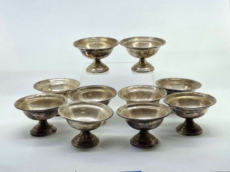 DESCRIPTION: 10) STERLING SILVER FOOTED BOWLS, 4X2-3/4" 84.11 G/EACH, REINFORCED WITH CEMENT.. CONDITION: Please See Photos For Condition. Condition Is Commensurate With Age And Use. We Aim To Take Additional Photos Of Any Noticeable Damage Or Defect. Please Email Auctionmanager@Pacificauctions.Net For Any Additional Condition Inquiries.