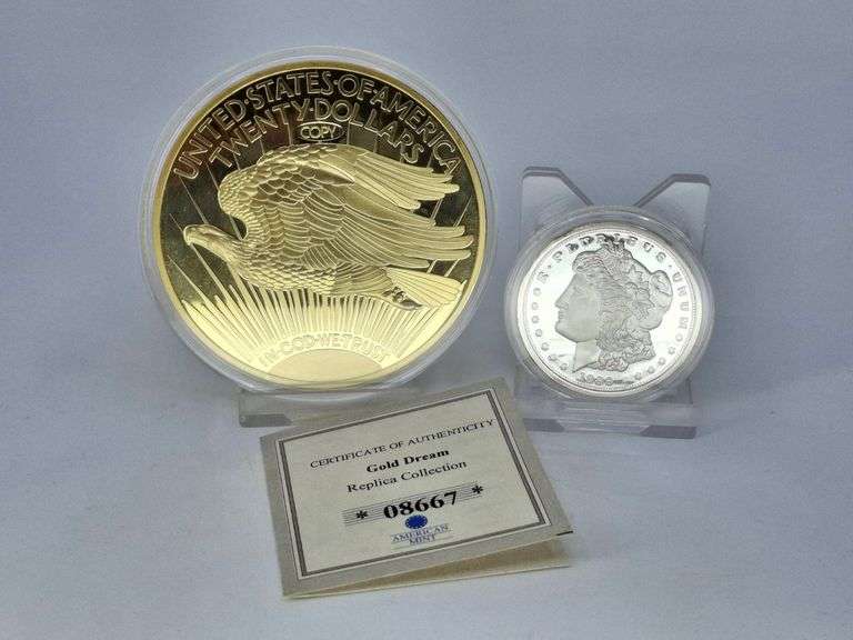 DESCRIPTION: GOLD 1933 DOUBLE EAGLE PROOF AND 1889 MORGAN SILVER DOLLAR COPY. CONDITION: Please See Photos For Condition. Condition Is Commensurate With Age And Use. We Aim To Take Additional Photos Of Any Noticeable Damage Or Defect. Please Email Auctionmanager@Pacificauctions.Net For Any Additional Condition Inquiries.