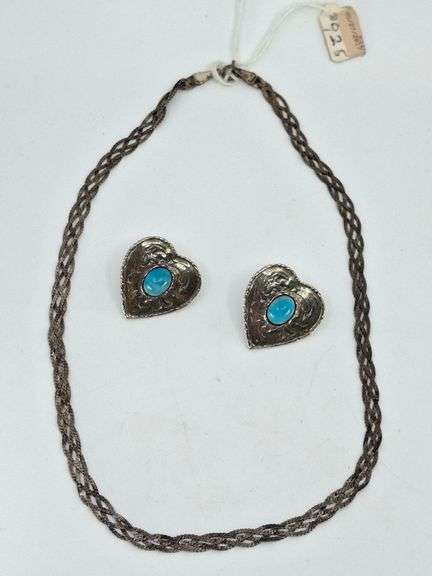 DESCRIPTION: SILVER & TURQUOISE HEART EARRINGS AND BRAIDED SILVER NECKLACE, MEX 925 . CONDITION: Please See Photos For Condition. Condition Is Commensurate With Age And Use. We Aim To Take Additional Photos Of Any Noticeable Damage Or Defect. Please Email Auctionmanager@Pacificauctions.Net For Any Additional Condition Inquiries.