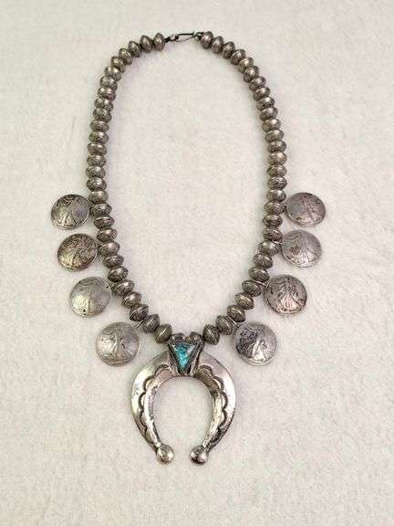 DESCRIPTION: VINTAGE NATIVE AMERICAN SILVER COIN NAJA SQUASH BLOSSOM NECKLACE, 27". EIGHT (8) 1940s SILVER LIBERTY WALKING HALF DOLLARS, ONE HUNDRED SIXTEEN (116) 1940s LIBERTY DIMES, NAJA WITH NATURAL TURQUOISE STONE. 424.39 TOTAL GRAMS.. CONDITION: Please See Photos For Condition. Condition Is Commensurate With Age And Use. We Aim To Take Additional Photos Of Any Noticeable Damage Or Defect. Please Email Auctionmanager@Pacificauctions.Net For Any Additional Condition Inquiries.