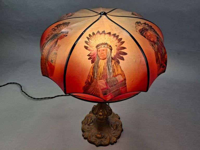 DESCRIPTION: LARGE ANTIQUE REVERSE PAINTED LAMP, WITH NATIVE AMERICAN CHIEF, 12"x17"H(BASE+SHADE), SHADE IS APPROX. 12X5"H, SHADE BASE DIAMETER 10”, CONDITION: Please See Photos For Condition. Condition Is Commensurate With Age And Use. We Aim To Take Additional Photos Of Any Noticeable Damage Or Defect. Please Email Auctionmanager@Pacificauctions.Net For Any Additional Condition Inquiries.