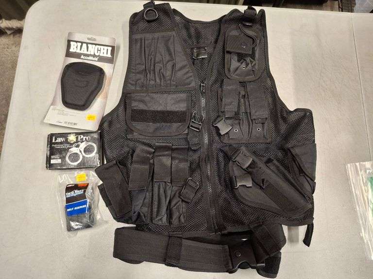 DESCRIPTION: BLACK TACTICAL VEST WITH ACCESSORIES, SIZE XL, HANDCUFFS OPEN CUFF CASE, UNCLE MIKE'S BELT KEEPER.
