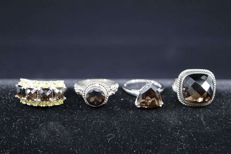DescriptionSet of Four Sterling Silver & Smoky Quartz, 925 approx. ring size s 6.5, 8, 8.75