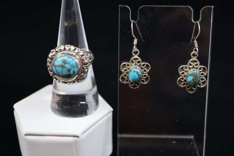 Turquoise & Sterling Silver Ring and Drop Earrings Set, 925 approx. ring size 7.75