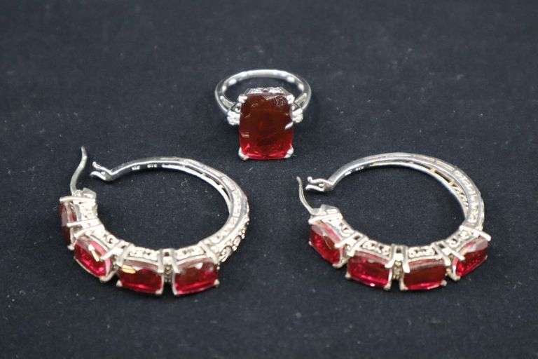 Sterling Silver & Red Quartz Ring & Earrings Set, 925 Approx. Ring Size 8.5