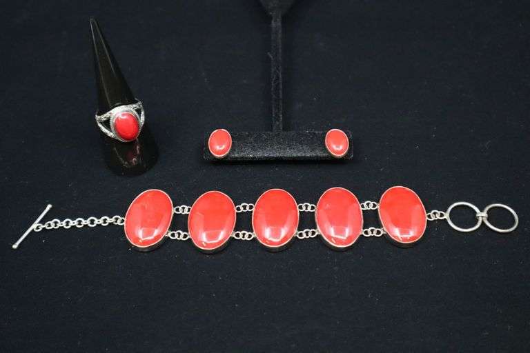 DescriptionRed Coral Sterling Silver Set, Ring, Bracelet, Earrings, 925 approx. ring size 8