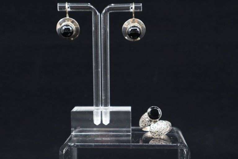 Sterling Silver & Onyx Ring and Earrings, 925 approx. ring size 7.75/adjustable