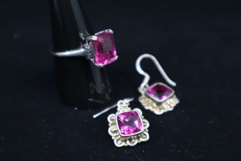 Sterling Silver & Rhodolite Garnet Ring and Earrings, 925 approx. ring size 8.5