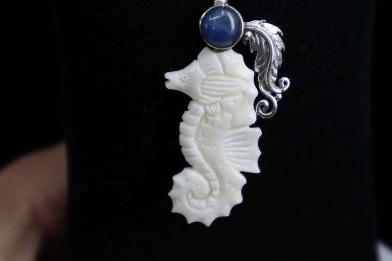 LOT 1057C - Sterling Silver Carved Bone Seahorse Pendant, 925