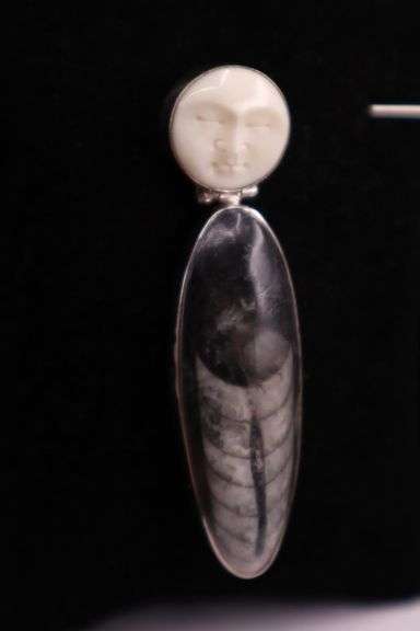 LOT 1052B - Sterling Silver Orthoceras With Carved Bone Moon Face Pendant, 925