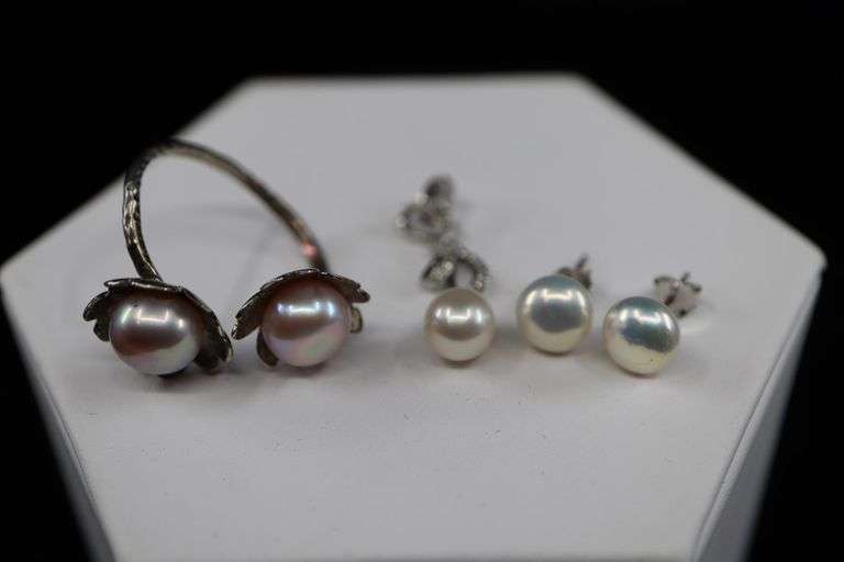 DescriptionSterling Silver & Cultured Pearls Pendant, Earrings and Ring, 925 approx. ring size 11.5/adjustable
