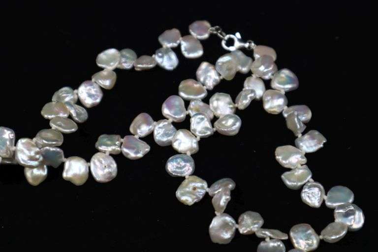 DescriptionCultured Pearl Necklace, Silver & White Petal Pearls, Sterling Silver Clasp, approx. 18"