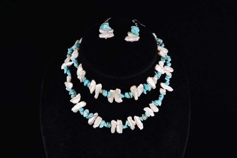 Cultured Pearls & Turquoise Chip Necklace and Earrings