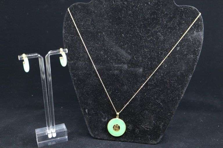 Gold Over Sterling Silver Jade Pendant with Neck Chain and Hoop Earrings